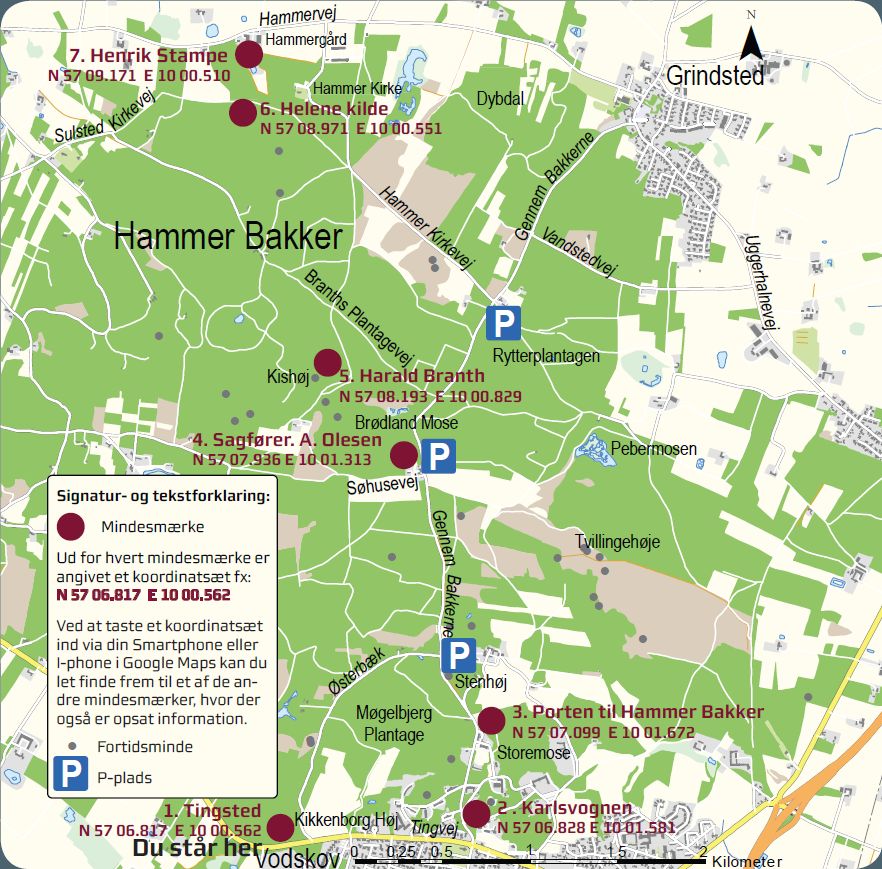 Klik på eet af de 7 mindesmærker, for link til Projekt Hammer Bakkers historiske kort..